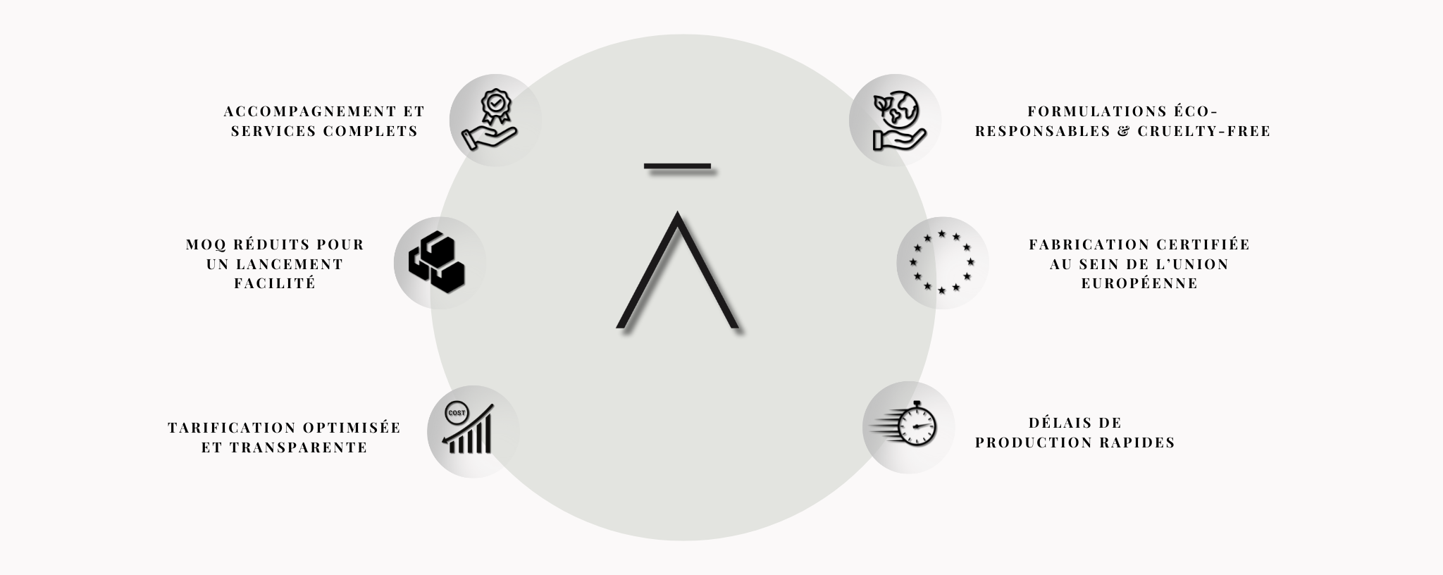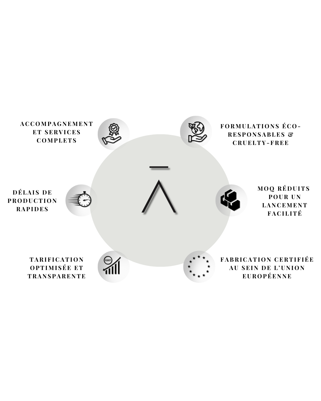 Grâce à des formules innovantes, des délais de production rapides et une équipe dédiée, nous assurons un accompagnement complet, de la conception à la fabrication, pour donner vie à votre projet et garantir des produits capables de se démarquer sur un marché de la beauté particulièrement concurrentiel.