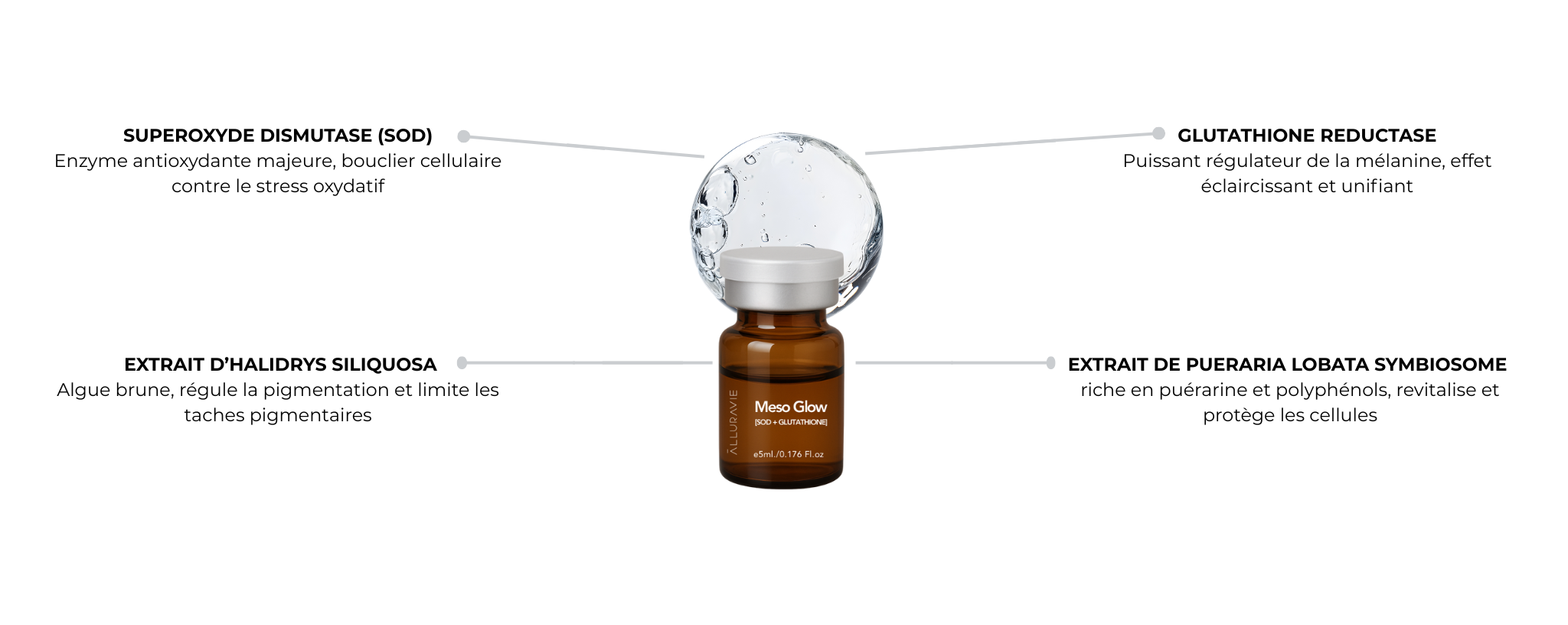 meso glow est une solution stérile de mésothérapie stérile développé pour raviver l’éclat cutané, uniformiser le teint et protéger la peau du stress oxydatif. Grâce à une synergie d’actifs innovants, il agit simultanément sur les mécanismes de la pigmentation, de la régénération cellulaire et du vieillissement prématuré. Résultat : une peau lumineuse, revitalisée et visiblement plus homogène.